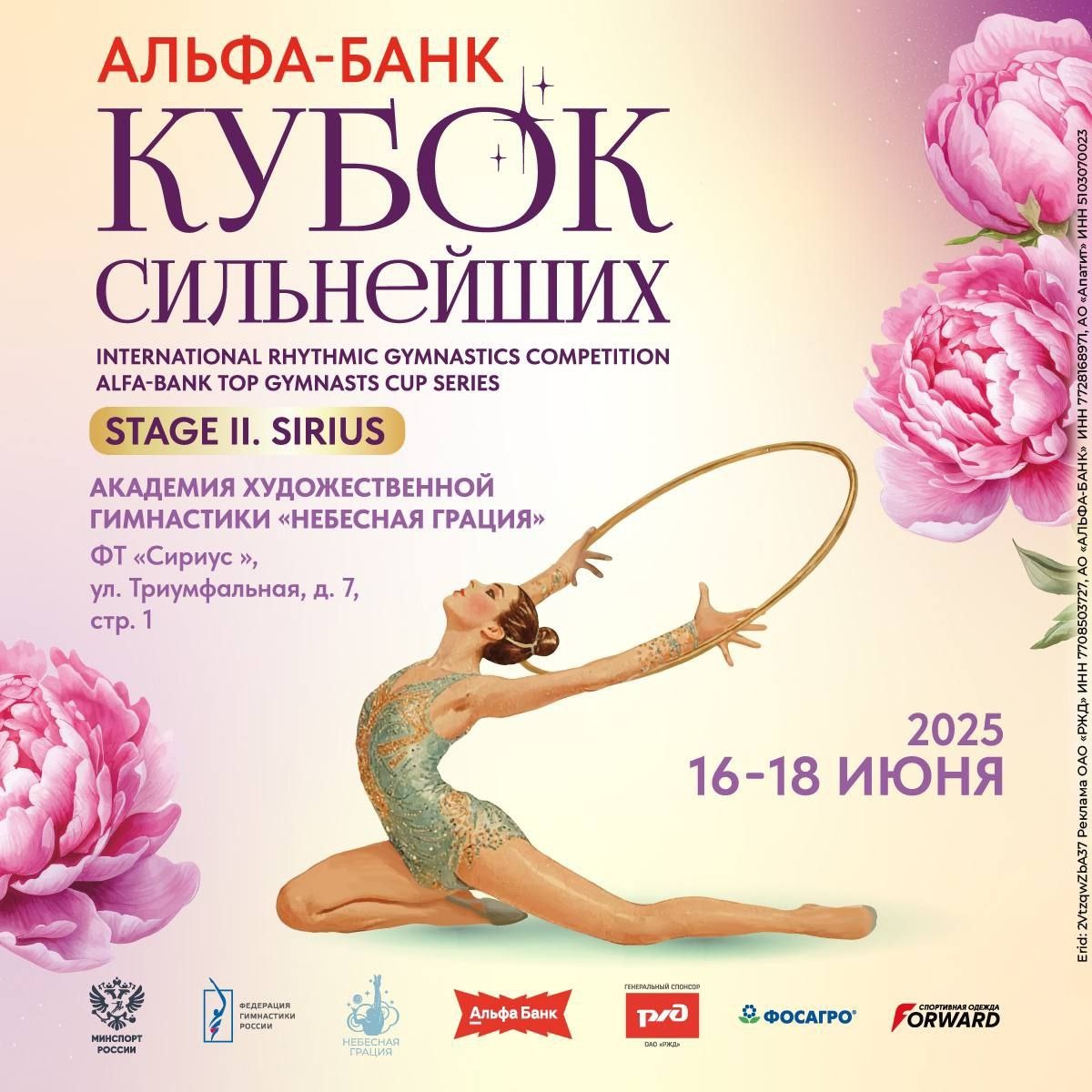 Альфа-Банк Кубок Сильнейших. II этап Международные соревнования по художественной гимнастике Пройдут с 16–18 июня 2025 года в ФТ "Сириус" В Академии художественной гимнастики "Небесная грация" Алины Кабаевой встретятся сильнейшие гимнастки из России, а также спортсменки национальных сборных зарубежных стран. В программе —индивидуальные и групповые упражнения, а также финалы отдельных видов многоборья Соревнования проводятся с 2022 года и включают 3 отборочных этапа и финал: 📍Москва 📍Сириус 📍Казань (26–28 сентября 2025 года) 🏆Финал пройдёт снова в Москве (19–21 октября 2025 года) 🎫 Билеты — скоро на Kassir.ru 📺Программа — на сайте ФГР 📹 Прямая трансляция — группа ФГР во ВКонтакте #АльфаБанкКубокСильнейших 🗣Подпишись на RG_live