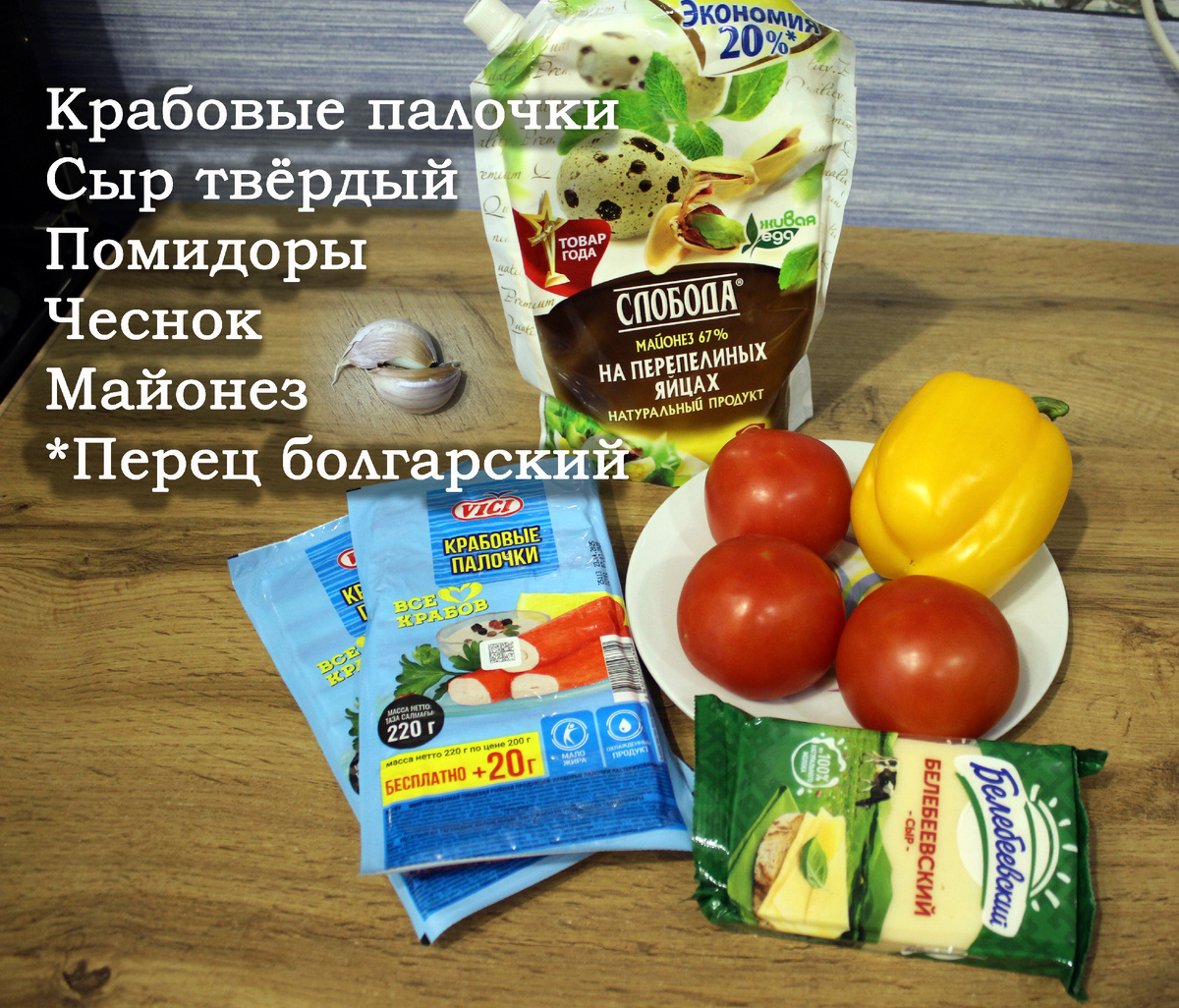 Всем привет! 👋 Делюсь рецептом салата, который мне недавно пришлось спасать, потому что попались невкусные помидоры. Поэтому советую брать на него либо домашние помидоры, либо черри (которые хотя бы похожи на нормальные помидоры). В магазине мы обычно брали черри, но к сожалению, в этот раз их просто не оказалось на прилавках. Рецепт салата очень прост: НО! Из-за того, что мне попались пресные помидоры, я решила добавить болгарского перца 1 шт. И вышло очень даже не плохо! Сыр потёрла на тёрке. Крабовые палочки, помидоры, перец порезала, чеснок пропустила через чеснокодавилку. Добавила майонез, перемешала, дала остыть в холодильнике часа 2. Думаю, что имеют право на существование и первый, и второй вариант 😉 Просто я не очень люблю болгарский перец, и без него мне салат нравится больше... Только нужно тщательнее выбирать помидоры. К слову, зачем мы продолжаем растить огород, когда всё можно купить в магазине. Да вот за этим! Нормальные вкусные помидоры в магазине не продают! Ни разу