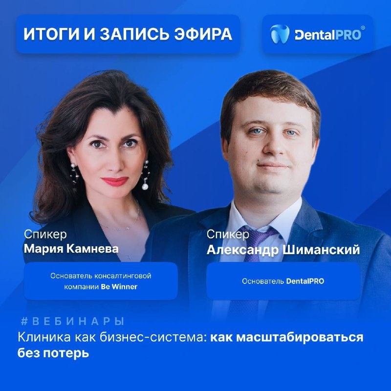 Вебинар «Клиника как бизнес-система: как масштабироваться без потерь» от команды 🦷 DentalPRO и компании Be Winner завершен. Выкладываем запись. Во время трансляции Александр Шиманский (создатель МИС DentalPRO) и Мария Камнева (основатель консалтинговой компании Be Winner) рассказали: ✔️ Почему без единой системы попытка масштабироваться может привести к катастрофе? ✔️ Как экосистема DentalPRO помогает контролировать филиалы и сеть? ✔️ На какие отчеты нужно смотреть ежедневно, а какие — просматривать раз в месяц? ✔️ Что такое DentalStore и как с его помощью можно кастомизировать управление? Посмотреть запись можно на ведущих площадках: 😄 VK 🥰 Rutube 😉 YouTube ⏱️ И не забудьте включить уведомления, чтобы не пропустить следующие трансляции. До встречи в прямом эфире! #Вебинары