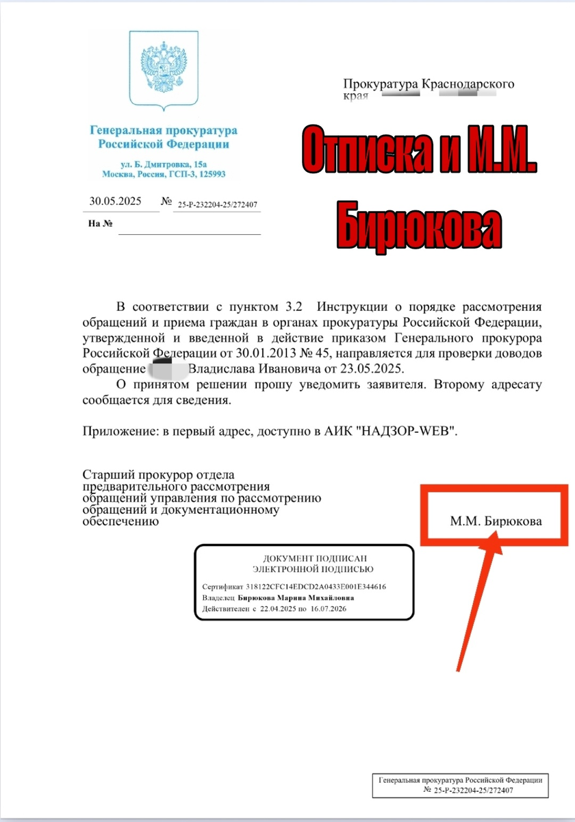 - Прокуроры лишь меняют исходящие номера (как в случае Бирюковой), но не анализируют суть жалоб.