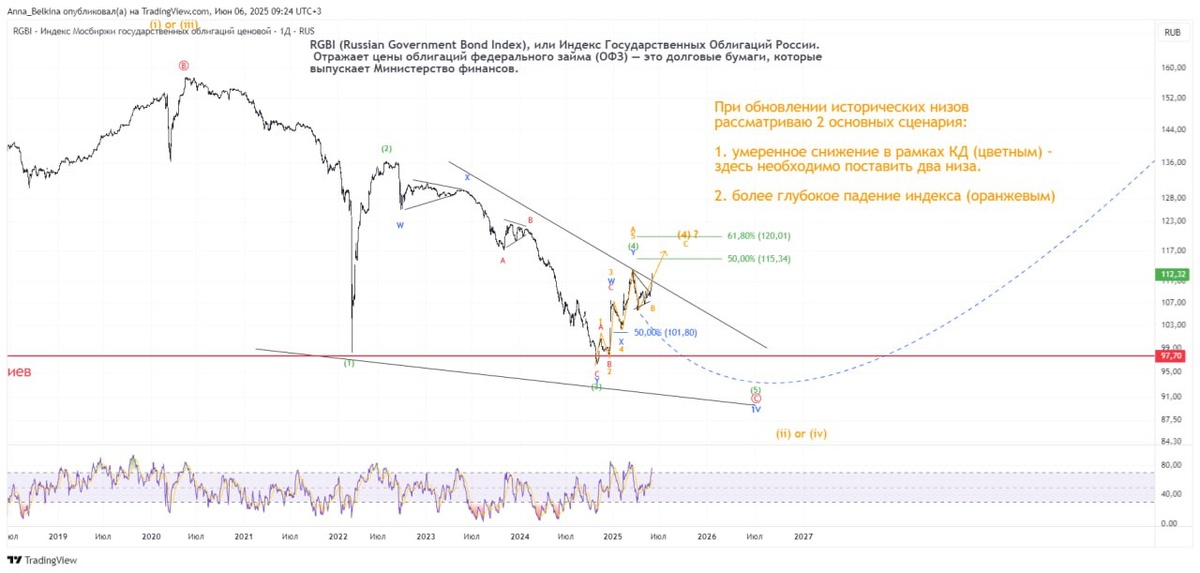 #RGBI Сегодня состоится очень важное событие для российского рынка – это заседание ЦБ РФ, где будет приниматься решение по ключевой ставке. Всю неделю шли интенсивные обсуждения по предстоящему решению ЦБ. Глава ВТБ Костин готов поспорить, что ставку понизят, а Альфа банк повысил ставки по депозитам до 30%. Очень противоречивая складывается ситуация. По технике, глобально индекс RGBI находится в стадии формирования волны [C] of iv, которая формируется в виде конечной диагонали с поставленной (или формирующейся) волной (4) of [C] of iv. Поскольку волна (2) of [C] of iv была довольной глубокой по откату, то у текущей волны (4) of [C] of iv есть пространство для дальнейшего развития. Тем не менее, глобально структура конечной диагонали не укомплектована и после завершения отката ожидаю продолжения снижения на долговом российском рынке. Не является ИИР 💪 Бот Закрытого Канала