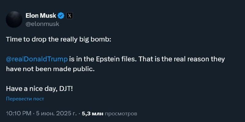 "Грязная бомба" Илона Маска. Ну а это, наверное, кульминация разразившейся войны между Маском и Трампом. Маск объявил, что настоящая причина того, что до сих пор не были обнародованы файлы их досье Эпштейна, это то, что в них есть сам Трамп. Читайте полностью наш материал в статье в нашем Телеграм канале: ➡️➡️➡️ ""Грязная бомба" Илона Маска." ⬅️⬅️⬅️
