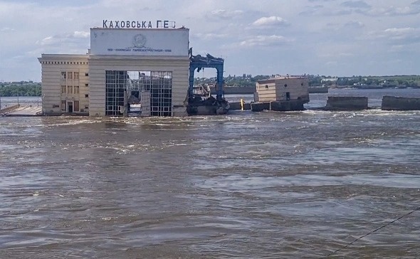 - Приблизительно в 02:50 по московскому времени произошло обрушение верхней части дамбы Каховской ГЭС. Были разрушены 11 из 28 пролётов. Поднявшийся уровень воды ниже по течению Днепра привёл к затоплению городов и посёлков как на левом, так и на правом берегу. В зоне бедствия на правом и левом берегах Днепра оказались в общей сложности до 40 тысяч мирных жителей.