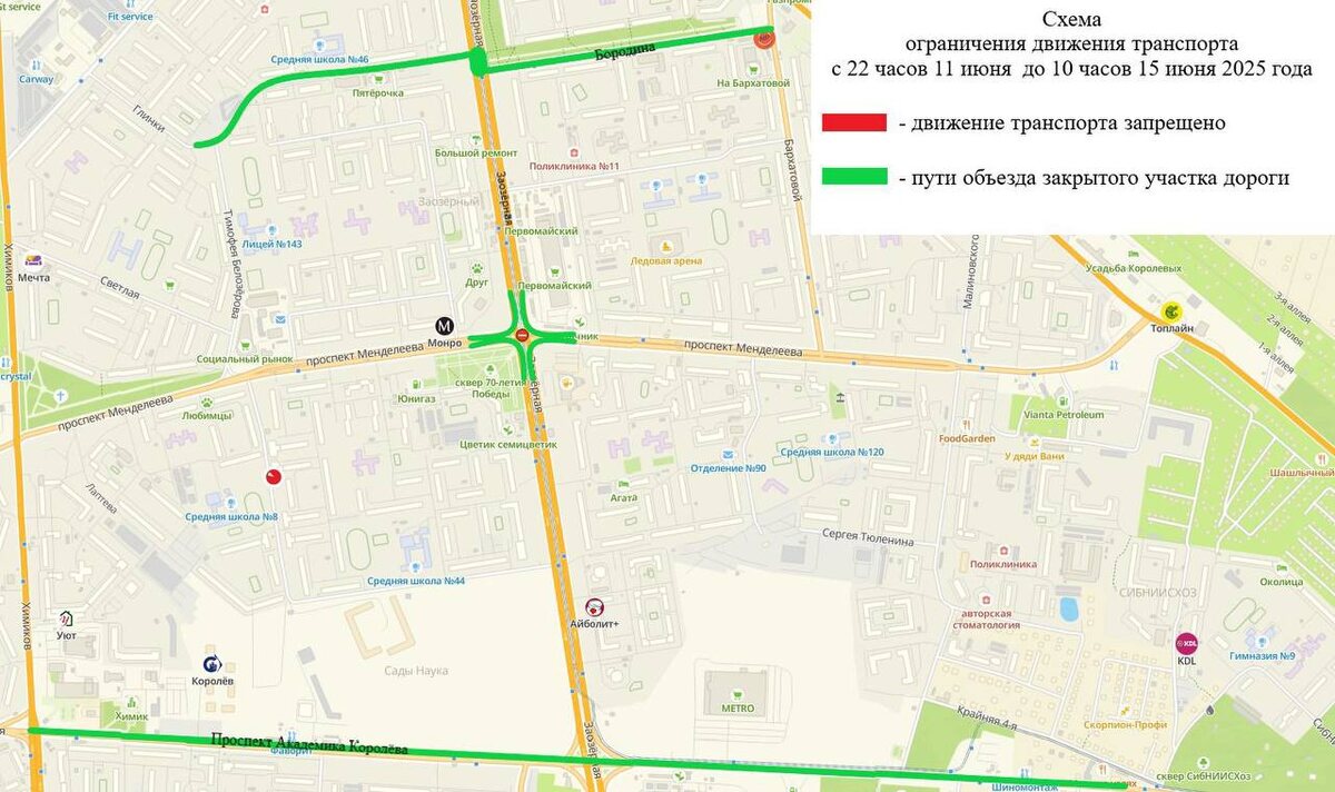 С 22:00 11 июня до 10:00 15 июня в Омске временно закроют движение на проспекте Менделеева в районе пересечения с улицей Заозерной. Это связано с капитальным ремонтом трамвайного пути по обращению муниципального предприятия «Электрический транспорт».