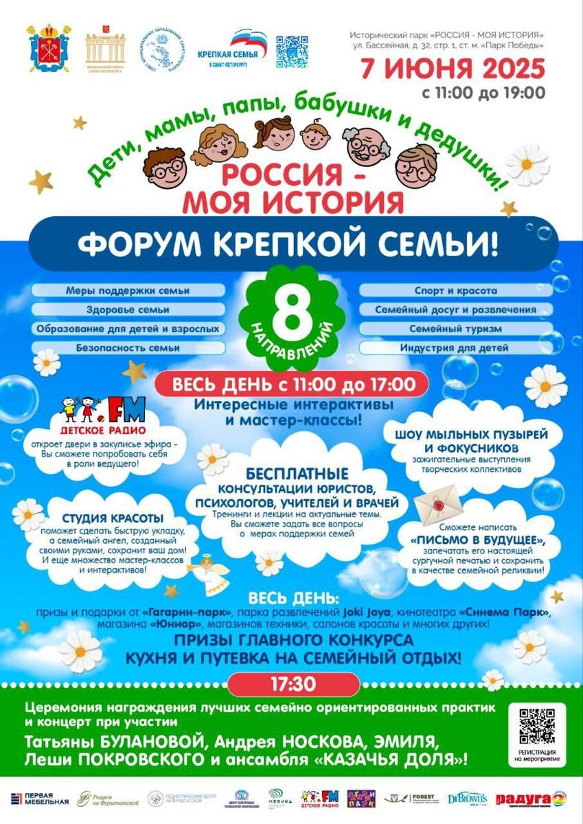 👨👩👧 Форум крепкой семьи пройдёт в Петербурге В мультимедийном парке «Россия — моя история» состоится форум, посвящённый важным аспектам семейной жизни — от здоровья и воспитания до досуга и правовой поддержки. Гостей ждут мастер-классы, тренинги, интерактивные зоны, консультации специалистов, выступления артистов и конкурсы с ценными подарками. Среди них — отдых, бытовая техника и сертификаты от партнёров. Завершится форум концертной программой с участием Татьяны Булановой, Андрея Носкова и других артистов. 📆 7 июня с 11:00 до 17:00 📍 Бассейная ул., 32 🎫 Вход свободный Фото: предоставлено организаторами Петербургский дневник