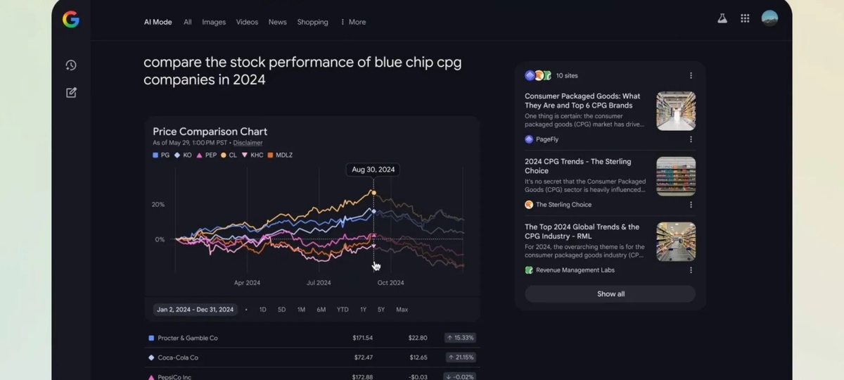 🔥 Google внедряет 🧮 новые графики и визуализации в AI Mode! Теперь в поиске по финансам вы можете легко анализировать данные, сравнивать акции и создавать чарты просто с помощью речи! 🚀 Время — сэкономлено: всё генерится автоматически, интерпретируя ваш запрос на основе GPT- Gemini и его мульти-модальных технологий! 💡 Пример: сравните акции разных компаний за год — всё визуально, интерактивно и удобно. Настраивай временные рамки 🤳 и задавай дополнительные вопросы прямо по графикам! ✨ Уже в тесте для пользователей Labs! Предыдущие обновления — до Gemini 2.5, Deep Search и даже встроенные рекламы — делают поиск мощнее. Готовы ли вы к умному финансам будущему? 💥 #Google #AIMode #Финансы #Технологии #Инновации