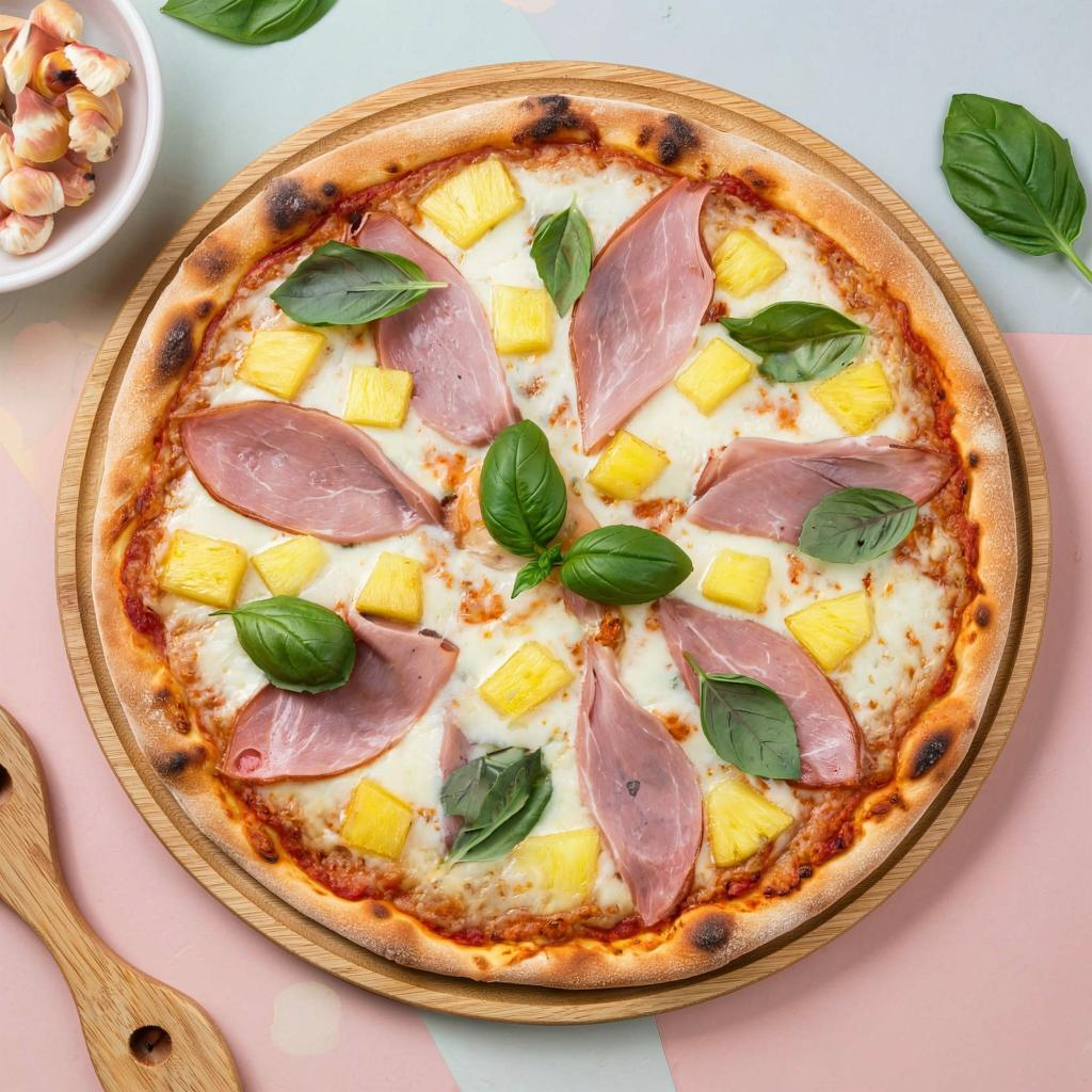 - Мука пшеничная — 250 г - Вода — 150 мл - Дрожжи сухие — 5 г (1 чайная ложка) - Сахар — 1 чайная ложка - Соль — 0,5 чайной ложки - Оливковое масло — 2 столовые ложки - Томатный соус — 150 г - Тертый сыр (лучше смесь моцареллы и чеддера) — 150 г - Ветчина — 100 г (нарезанная кубиками) - Консервированные ананасы — 100 г (предварительно слейте сок) 1. Приготовление теста: - В теплой воде растворите дрожжи и сахар, оставьте на 5-7 минут до появления пены. - В миске просейте муку, добавьте соль. - Влейте дрожжевую смесь и оливковое масло, замесите мягкое эластичное тесто. - Накройте тесто полотенцем и оставьте в тёплом месте на 1-1,5 часа, чтобы оно подошло и увеличилось в объёме. 2. Подготовка основы: - После подъёма разделите тесто на две части (или одну, в зависимости от желаемого размера). - Раскатайте каждую часть в круг диаметром около 30-35 см. - Переложите раскатанное тесто на противень, застеленный бумагой для выпечки. 3. Сборка пиццы: - На тесто равномерно распределите томатный с