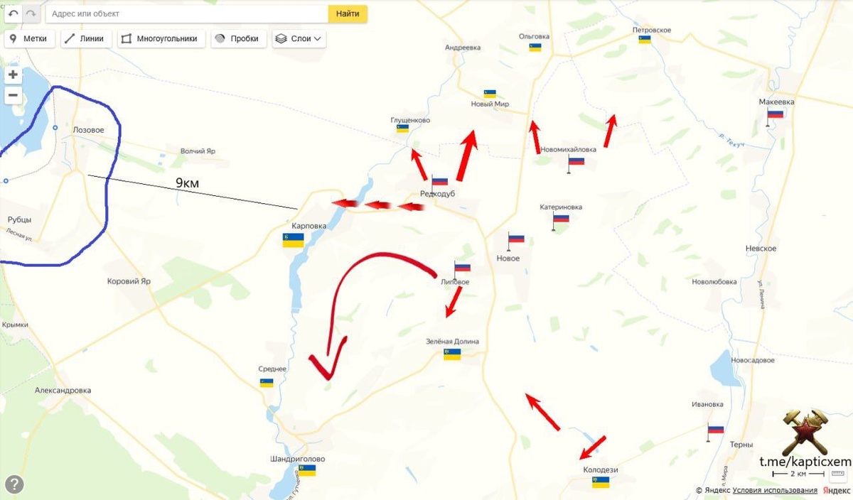 В ответ на пост Изюмское направление. Идет расширение клина наступления(изменения) ВС РФ добили все опорники на гребне между Липовое и Колодези, зажали в тиски с юга и севера Зелёную долину и вот вот перережут физически дорогу на Шандриголово, движение по ней и так осложнено из за наших ДРГ и дронов. Идёт заметное продвижение севернее Колодезей. Схемы и карты