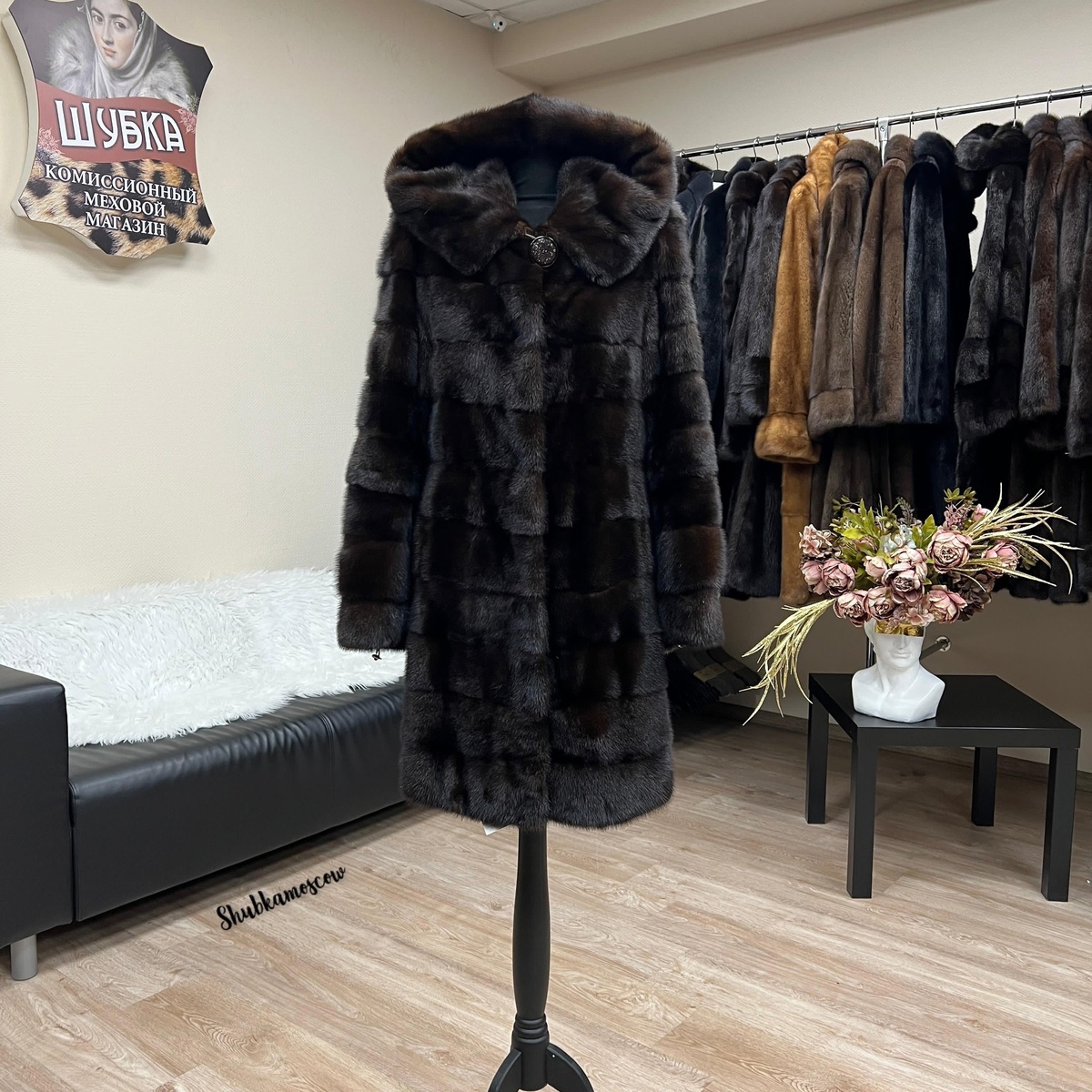 ☑️Норковая шуба, прямая модель в поперечной раскладке шоколадной норки, удобный капюшон, рукав моделируется в 3/4, есть кулиса по талии и рукавам, в хорошем состоянии, подходит на миниатюрную фигуру размера 40-42.