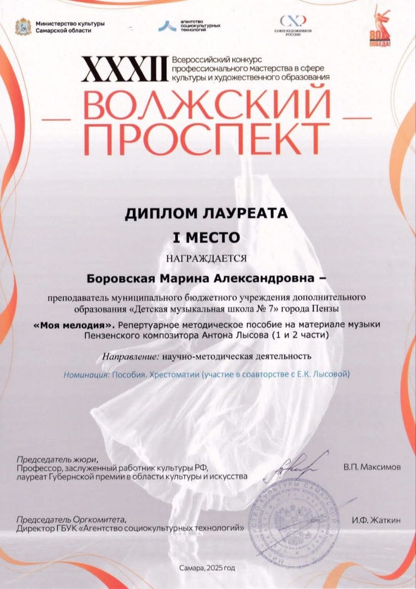 💫 С 20 января по 24 сентября 2025 года в городе Самара проходит XXXIl Всероссийский конкурс профессионального мастерства в сфере культуры и художественного образования "Волжский проспект". ✅ В феврале этого года преподаватели Боровская Марина Александровна (ДМШ № 7) и Лысова Евгения Константиновна (ДМШ им. Н. А. Котляра) города Пензы представили на конкурс 1 и 2 части учебно-методического пособия "Моя мелодия". В пособие вошли музыкальные произведения, написанные для детей и юношества Пензенским композитором Антоном Лысовым (1968- 2022). 💫 В номинации "Научно-методическая деятельность" авторы пособия - Боровская М. А. (ДМШ № 7) И Лысова Е. К. (ДМШ им. Котляра) заняли 1 место и были удостоены звания Лауреатов 1 степени.🏆 💫 Учебно-методическое пособие "Моя мелодия" включено в список лучших конкурсных работ, составляющих 5 % от всего материала, представленного в "Волжском проспекте". 👏Поздравляем с победой!👏 #ДМШ7гПензы #penza_kult #Новости_культуры58