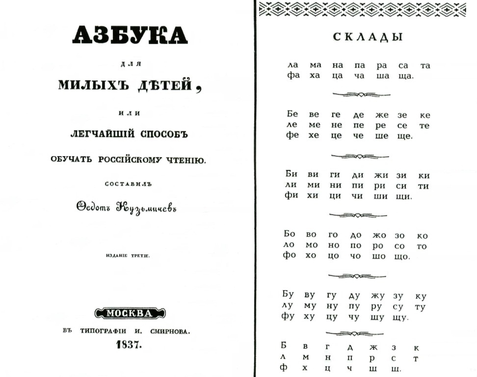 Что, прямо вот все буквы сразу показывать? Дети же их ещё не знают и просто запутаются! Может, всё-таки как-то постепенно их давать? Знакомые вопросы? Сомневающиеся в методике Зайцева, похоже, сильно недооценивают детей. А зря, те гораздо умнее и пытливее, чем думает большинство родителей и учителей! А вот древние азбуки учитывали возможности детей, размещая с первых страничек СКЛАДЫ в разных сочетаниях, сразу после этого — детский молитвенник. И всё! Процесс обучения чтению завершён. Всё, что связано с обучением буквам "в час по чайной ложке", а также звукам и их классификацией, потом звуковым и графическим сочетаниям их, фонетическим анализом, делением на слоги и смысловым объединением их в слово, а ещё "сидением" в первом десятке до 7-и лет, весь первый класс счётом до 20 (!), второй класс (на 9-м году жизни) до 100..., — есть раздутая программа с итогом в виде отставания умственного развития. Николай Александрович называл это заведомым "одебиливанием" детей. Современная школьная и