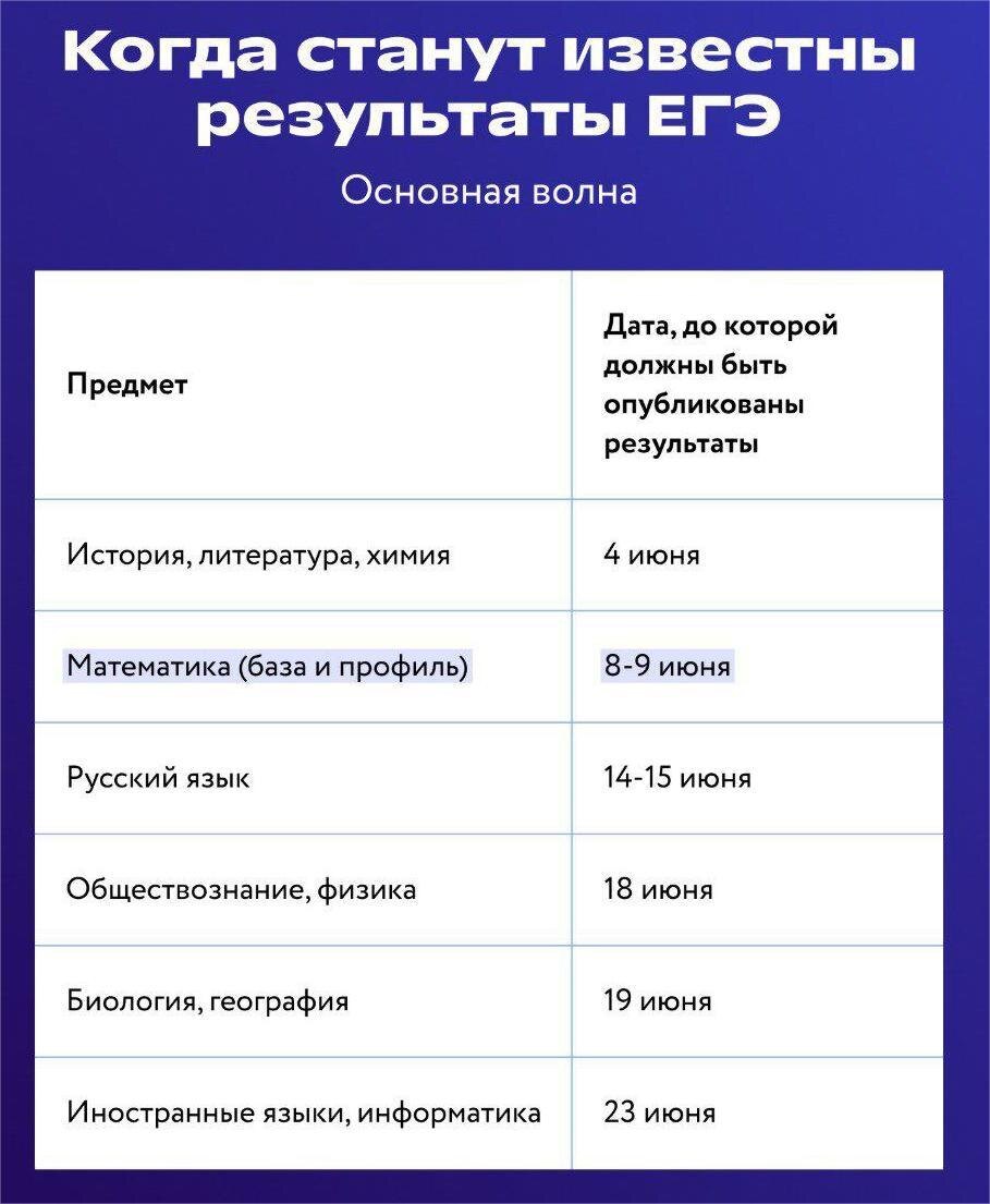 Во всех документах о ЕГЭ указано, что результаты будут опубликованы «до такого-то числа». Это значит, что они могут появиться и раньше. Если у кого-то из ваших друзей результаты уже известны, а у вас ещё нет, не спешите беспокоиться. Лучше сверьтесь с таблицей и ориентируйтесь на указанные в ней даты.
