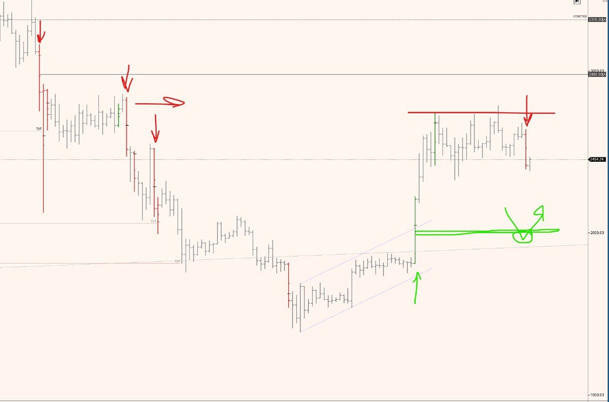 График Эфира. Давно жду отработки вот этой формации - тест покупателя с одновременным снятием перекупленности. Обратите внимание на наличие усилий на покупку и на продажу (это бары соответствующего цвета и дополнительно я отметил их стрелочками). Данные усилия получает мой софт анализирующий поток ордеров с биржи. Это позволяет не рисовать "палочки и черточки" = гадание на "кофейной гущи", а формировать весьма статистически значимые уровни. Продавцы стоят плотным рядом, что существенно отличается от того что я вижу на биткойне и это хорошо дополняет мой глобальный взгляд на "альтсезон" я писал о нем выше в постах. Не ИИР