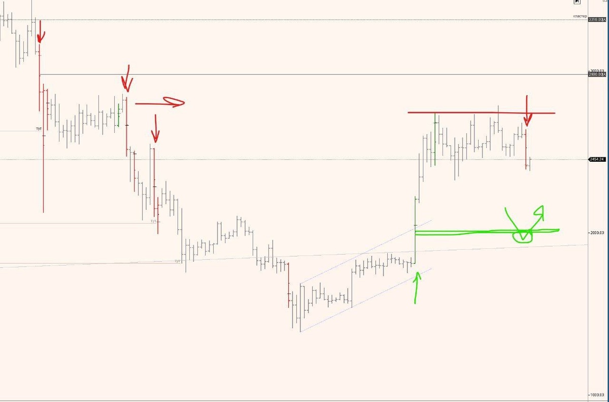 График Эфира. Давно жду отработки вот этой формации — тест покупателя с одновременным снятием перекупленности. Обратите внимание на наличие усилий на покупку и на продажу (это бары соответствующего цвета, дополнительно я отметил их стрелочками). Данные усилия получает мой софт, анализирующий поток ордеров с биржи. Это позволяет не рисовать «палочки и черточки» — гадание на кофейной гуще — а формировать весьма статистически значимые уровни. Продавцы стоят плотным рядом, что существенно отличается от того, что я вижу на Биткойне. Это хорошо дополняет мой глобальный взгляд на «альтсезон» — я писал о нём выше в постах. Не ИИР.