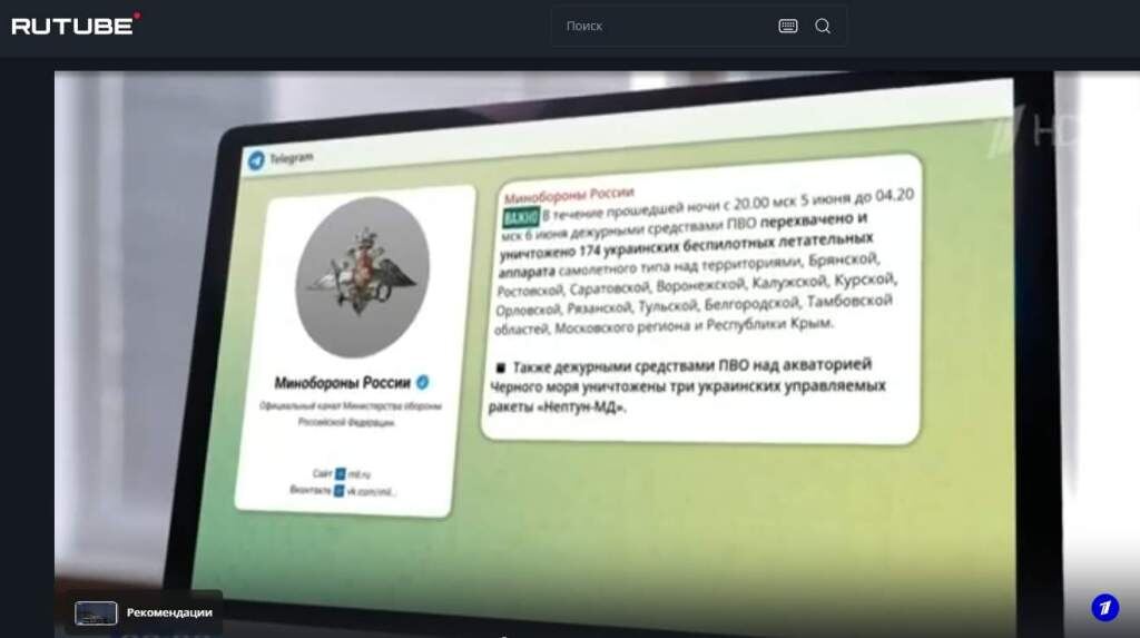 За ночь средства ПВО сбили 174 украинских беспилотника над территориями, Брянской, Ростовской, Саратовской, Воронежской, Калужской, Курской, Орловской, Рязанской, Тульской, Белгородской, Тамбовской областей, Московского региона и Республики Крым. Об этом сообщают в Минобороны. Также были сбиты три ракеты «Нептун-МД» над акваторией Черного моря. Ранее, 5 июня, сообщалось о 30 дронах, уничтоженных российскими средствами ПВО. Беспилотники перехватили над Ростовской, Белгородской, Курской областями, а также над Крымом и Московским регионом. Фото: скрин с видео 1tv.ru