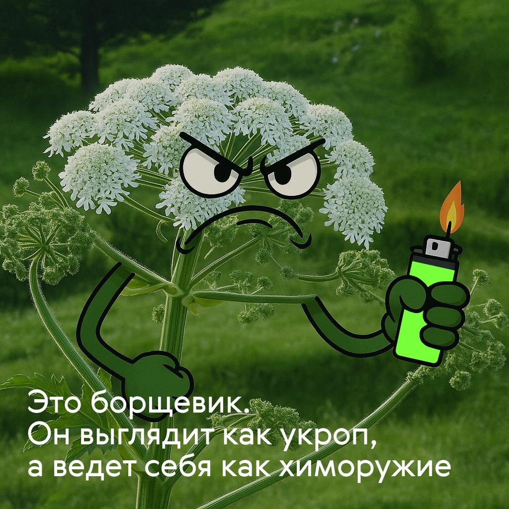 Видели альтернативную вселенную зомби из сериала «Один из нас» с борщевиком вместо грибов? Пока постапокалипсис не предвидится, но инструкцию по оказанию первой помощи при ожоге борщевиком мы все-таки напишем. 🔥 Слегка промойте место ожога водой, чтобы удалить сок. На природе воды у вас может и не оказаться, подойдет салфетка. Главное — не трите кожу, иначе место поражения увеличится. 🔥 Закройте кожу от ультрафиолета. Вас обжигает не сам сок, а результат того, что его светочувствительные вещества активизируются под UV-лучами. Если вы быстро скроетесь в тени, риск ожога будет минимален. Крем с высоким SPF, к сожалению, не сильно поможет — фуранокумарины борщевика под солнцем гораздо мощнее SPF-защиты. 🔥 Как окажетесь ближе к цивилизации, обработайте кожу водой с густой мыльной пеной. Умудрились получить ожог? У вас есть около часа, чтобы добраться до клиники. Не потому что вы превратитесь в зомби, конечно. Ожог полностью проявляется спустя час, и к этому времени лучше выпить антиг