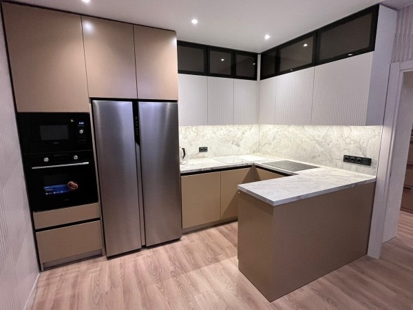 - Фасады из МДФ, обработанные специальными влагостойкими составами, и стеклянные фасады характеризуются высокой устойчивостью к механическим повреждениям, влаге. Их легко очищать от сильных загрязнений, что упрощает уход за кухонным гарнитуром.