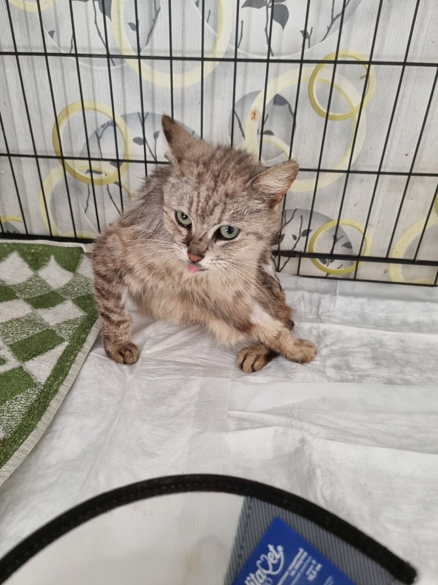 Сначала нам было негде разместить это чудо, и мы, не найдя быстрого решения, временно устроились в душевой кабинке. Вчера ночью переселение было в клетку, при обработке и уколах она сожрала мои руки. Утром кошечка сидела без воротника, ищу запасные руки.😂