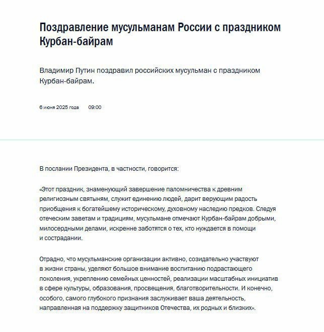 ▶️ Путин поздравил российских мусульман с праздником Курбан-байрам