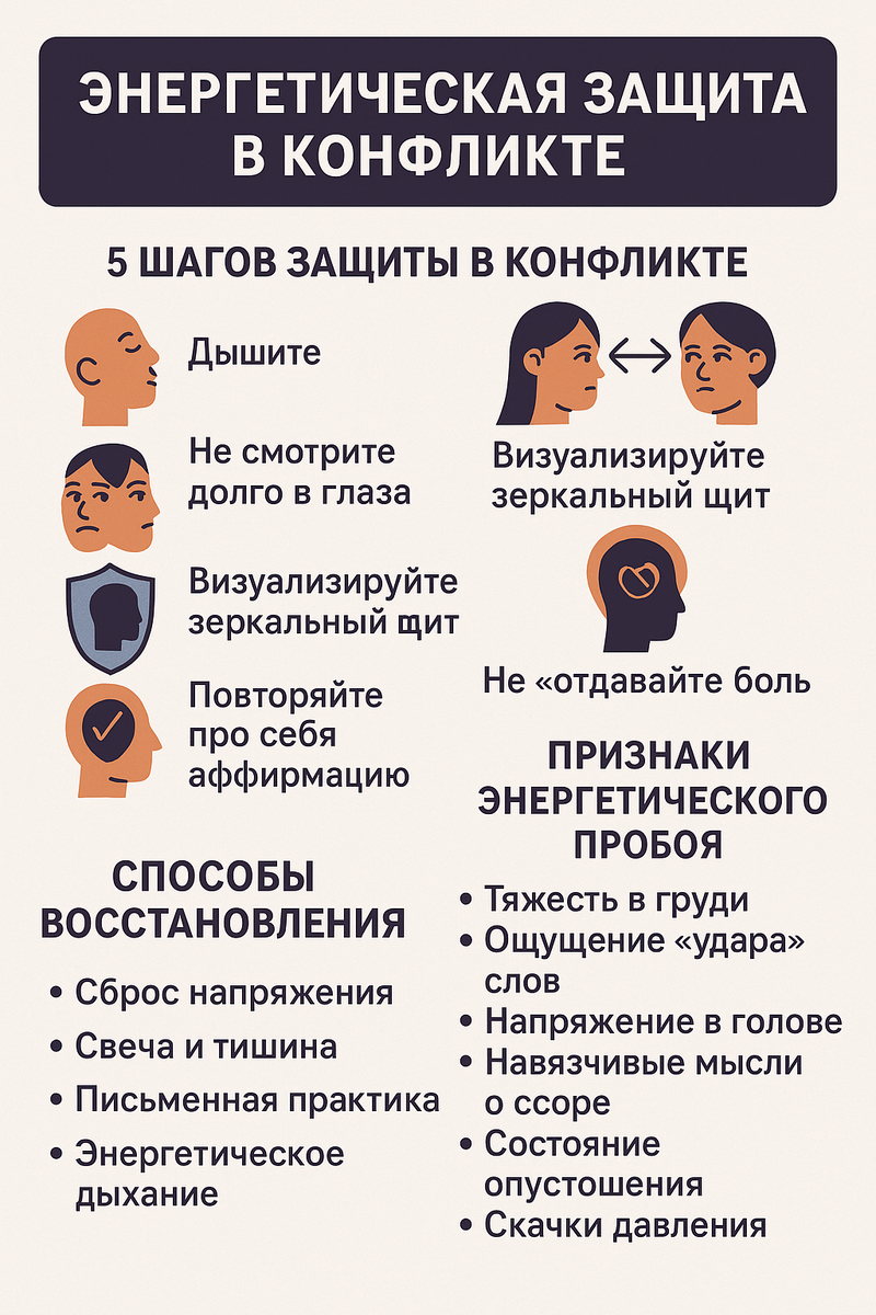 Конфликты — неотъемлемая часть жизни. Мы можем стараться избегать их, быть вежливыми, уступать, но рано или поздно каждый сталкивается с ситуацией, где приходится отстаивать себя, выслушивать претензии, защищаться или быть мишенью для чьей-то агрессии. И здесь речь идёт не только о словах — в конфликте происходит мощный обмен энергией, часто деструктивный. Каждое столкновение — это потенциальная утечка сил. После конфликта человек может чувствовать: Это — последствия энергетического пробоя. Но его можно избежать — если научиться защищать своё поле во время споров. Во время ссоры: Человек, особенно чувствительный, может словно впитать в себя негатив другого. И если не выстроить границы — потом долго «отходить». «Моё поле закрыто. Всё чужое отражается. Мои слова идут от центра.» Сохраняйте ровное дыхание. Даже если вас провоцируют — контролируйте выдох. Это заземляет и удерживает поле целостным. Если видите, что человек «атакует» взглядом — отводите взгляд на переносицу, плечо, руку.
