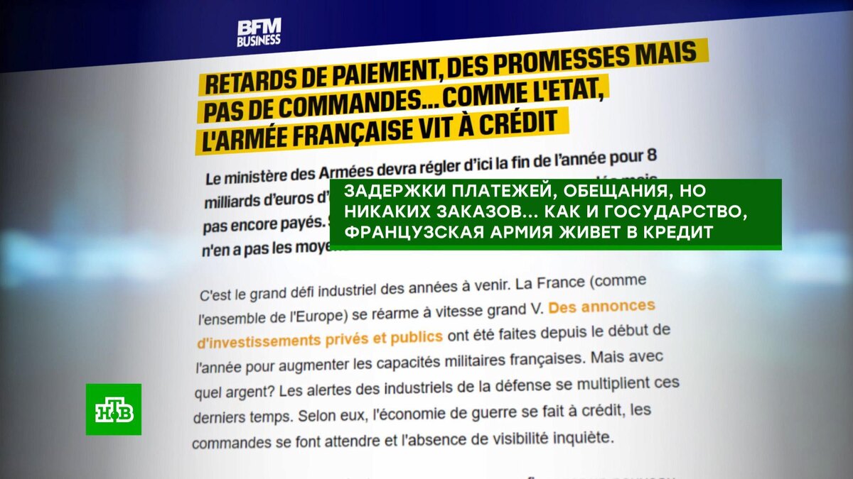 [ Смотреть видео на сайте НТВ ] Французские власти не рассчитали силы в поддержке Украины и задолжали своим оборонным компаниям 8 миллиардов евро. Как сообщили местные СМИ, правительство получило военную технику, но так за нее и не расплатилось. При этом долг перед предприятиями продолжает расти. Журналисты критикуют президента Эммануэля Макрона за то, что он только и говорит, что о военной экономике, но в итоге страна пытается бряцать оружием в кредит. В бюджете заложили больше 400 миллиардов евро на оборонку, но эти деньги уже давно закончились. Кроме того, госдолг Франции уже находится на рекордно высокой отметке. Минфин страны призывает к экономии. И как раз экономить пятая республика решила не на снабжении оружием себя и Украины, а на социальных выплатах. [ Смотреть видео на сайте НТВ ]