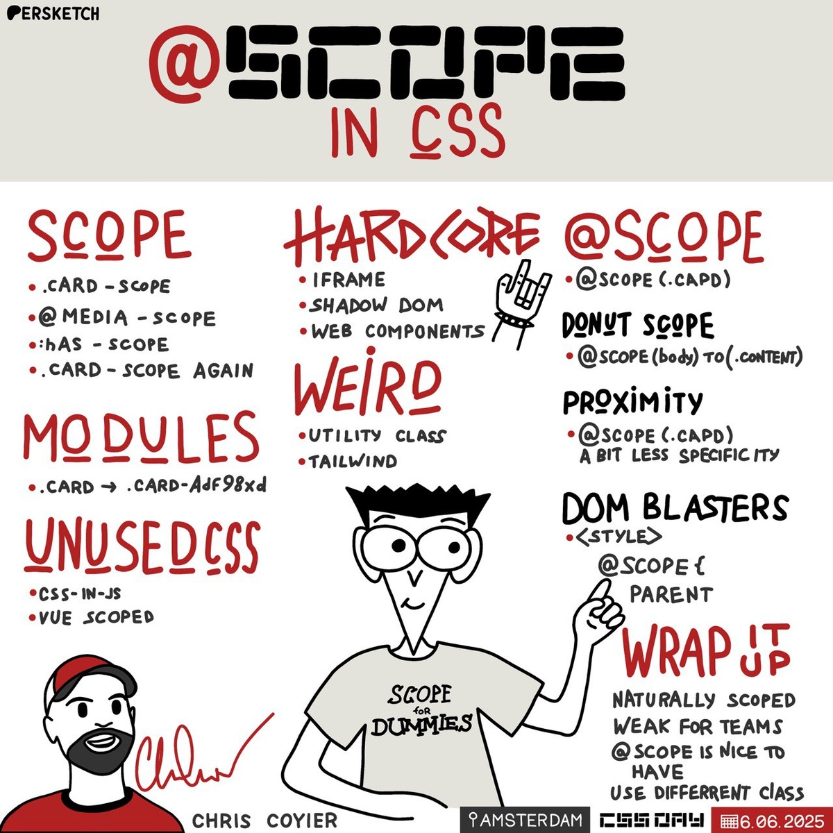#CSSDay2025 №8 Заметки к докладу "Scope in CSS". Что надо знать о скоупе в CSS? Любой CSS-селектор и есть скоуп. Но сейчас есть гораздо более интересные возможности по управлению скоупом: скоуп-бублик, определение доступности и прочие чудеса директивы @scope. Правда, лучший способ всё ещё — уникальные имена классов.