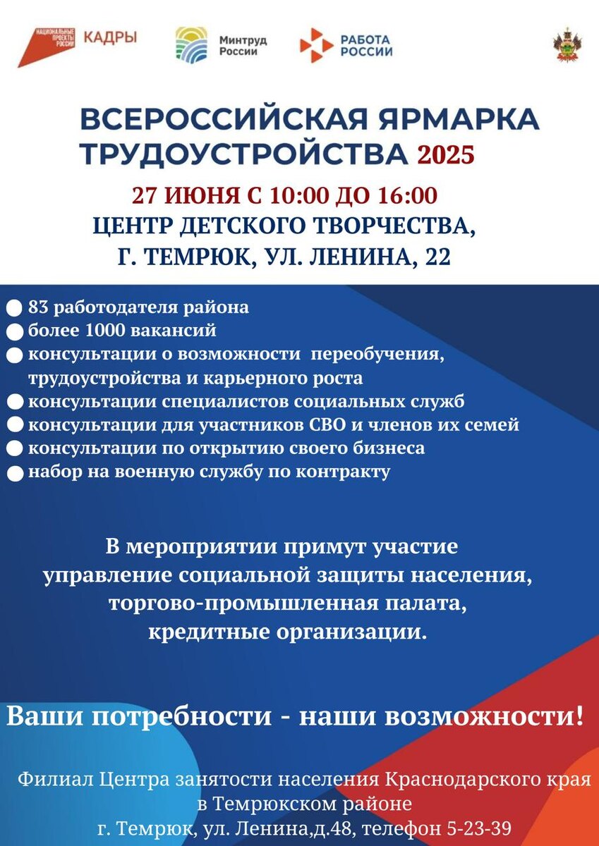 📢 ВСЕРОССИЙСКАЯ ЯРМАРКА ТРУДОУСТРОЙСТВА 2025 📅 Дата: 27 июня ⏰ Время: с 10:00 до 16:00 📍 Место: Центр детского творчества, г. Темрюк, ул. Ленина, 22 Что ждет участников: 83 работодателя района Более 1000 вакансий
