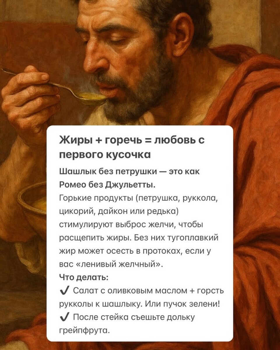 3 правила приема пищи, чтобы желчь текла рекой (а не водой из засорившегося крана) Листайте карусель ➡️ 1. Грейте, как римлянин. 2. Ешьте по расписанию, как швейцарские часы. 3. Сочетайте жиры с горчинкой, как шеф-повар. 4. 👇 Сохраните карусель, чтобы не забыть секреты здорового пищеварения!
