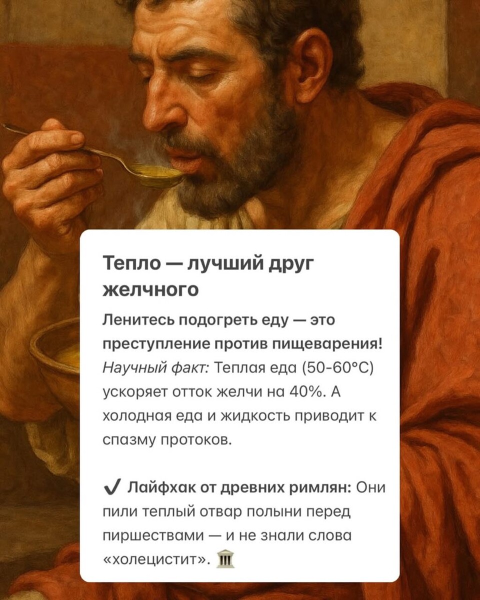 3 правила приема пищи, чтобы желчь текла рекой (а не водой из засорившегося крана) Листайте карусель ➡️ 1. Грейте, как римлянин. 2. Ешьте по расписанию, как швейцарские часы. 3. Сочетайте жиры с горчинкой, как шеф-повар. 4. 👇 Сохраните карусель, чтобы не забыть секреты здорового пищеварения!