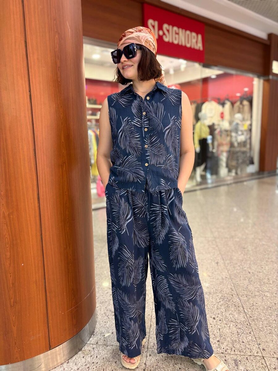 Моднявый итальянский костюм в синем цвете, принт пальмы 🌴 Что уже настраивает на беззаботные теплые деньки 🥰 Размер единый 46-50 Цена 7.500₽ 💘Купить онлайн ТЦ Щука 💘Купить онлайн ТПУ Планерная
