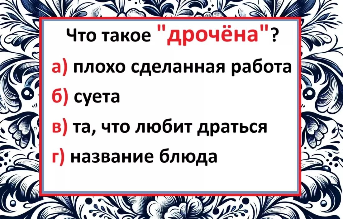 Итак, верный ответ — под буквой «г». Дрочёна — это национальное русское блюдо, род запеканки из смеси яиц, молока и муки или тёртого картофеля.