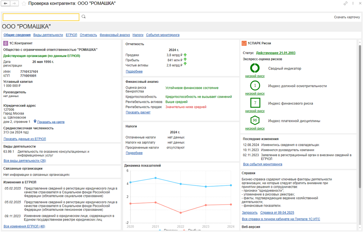 Забудьте о рисках! Получите полную картину о партнере за считанные минуты. С релиза 3.0.171 в программе "1С:Бухгатерия" доступен новый отчет "Проверка контрагента", который разрабатывался с учетом запросов и мнений пользователей. Преимущества нового отчета: · Значительно переработан внешний вид отчета; · По сравнению с отчетом "Досье контрагента" на главную страницу отчета "Проверка контрагента" для удобства анализа выведены дополнительные данные о контрагенте: o Сведения о налогах и сборах организации; o Финансовый анализ; o Виды деятельности контрагента; o Последние изменения в ЕГРЮЛ/ЕГРИП; o Динамика показателей продаж и прибыли. · В отчет "Проверка контрагента" добавлены данные из сервиса 1СПАРК Риски: o Экспресс-оценка рисков по индексам СПАРК; o Информация о последних изменениях из сервиса 1СПАРК Риски. Полная картина в одном месте: Быстро оцените финансовое состояние, юридическую чистоту и потенциальные риски сотрудничества на основе официальных данных. Состав тарифа: · Новый