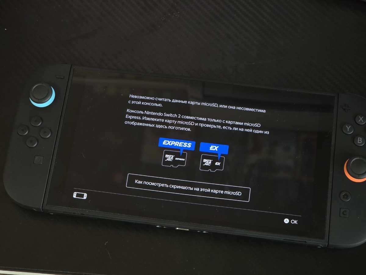 Много вопросов видел про SD-карты - мол, может всё-таки как-то можно обычные использовать? Вообще, Nintendo неоднократно заявляла достаточно чётко и однозначно: нет, можно только microSD Express. Но, видимо, тут тот случай, когда "надежда умирает последней") Что ж, вот результат, если подключаешь старую карту microSD в Switch 2. Единственное, как её можно использовать: импортировать с неё скриншоты, сделанные на первом Свиче (правда, для этого сначала на том Свиче надо прошивку обновить на самую последнюю). И всё. Для установки игр обычные microSD на Switch 2 использовать нельзя. Вообще. Для любых игр. И да, я тоже считаю, что это фигово: даже Xbox Series X и PS5 позволяют использовать старые накопители (HDD) для запуска игр предыдущих поколений.