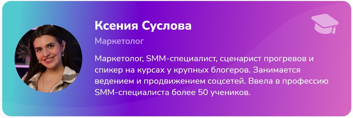 Маркетолог, SMM-специалист, сценарист прогревов и спикер на курсах у крупных блогеров. Занимается ведением и продвижением соцсетей. Ввела в профессию SMM-специалиста более 50 учеников.