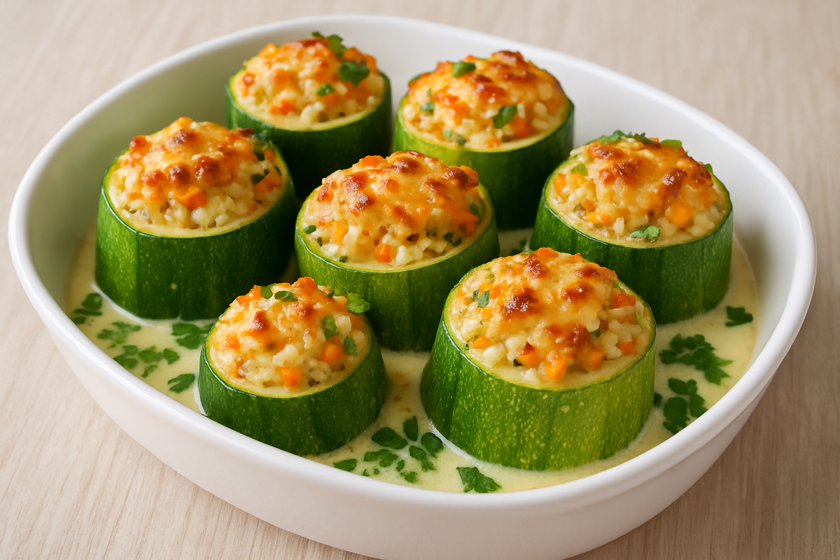 🍽️7 порций ⌛Время приготовления — около 1 часа 1. Кабачки очистить(по желанию), нарезать цилиндрами по 3–5 см, удалить сердцевину. 2. Отварить в подсоленной воде до полуготовности. 3. Морковь и лук обжарить на масле. 4. Смешать овощи с рисом, рублеными варёными яйцами, приправами — получается овощной фарш. 5. Наполнить кабачки этим фаршем с горкой. 6. Выложить в форму, смазанную маслом. Посыпать тёртым сыром и немного сбрызнуть маслом. 7. Запечь до румяности, затем залить сметаной и довести до кипения в духовке. 8. Подавать, посыпав рубленой зеленью.