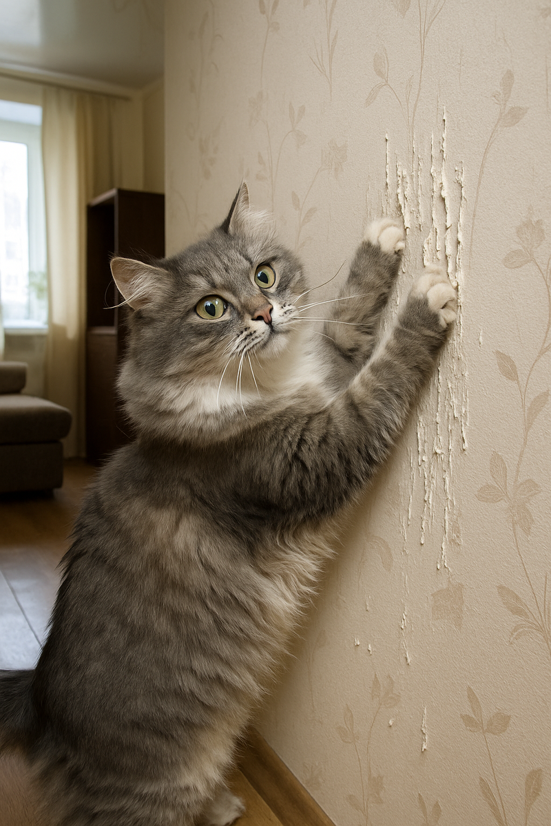 — У вас можно заказать картину из фото? Только не просто копию… — начал голос на том конце. — А чтобы было видно: кот — философ. И чтобы когти на обоях — не шалость, а высказывание. — Высказывание? — уточнили мы. — Конечно. Он вообще-то эстет. Просто выражается... когтями. Вот фото. Видите взгляд? Это не "Ой, меня поймали", это — "Разве ты не видишь, какое это искусство?" 📸 На фото — пушистый серый кот с глазами, полными важности и лёгкого вызова. Он застыл, держа лапы на стене, где остались свежие царапины. Фон — самый обычный интерьер, но в этом взгляде кота и в его позе — нечто почти театральное. Он будто говорит: «Ты ещё не понял, что я тут создаю?» 👩 — Это кот моего дедушки, — рассказала заказчица. — Тот всегда ворчит на испорченные обои, но всё равно гладит его за ушком. А кот каждый раз делает именно эту позу. Как будто ставит подпись: "Художник был здесь". 🎨 На картине: Интерьер превращён в сцену японской гравюры. Обои — как холст, когти — как кисть. Кот грациозен, как с