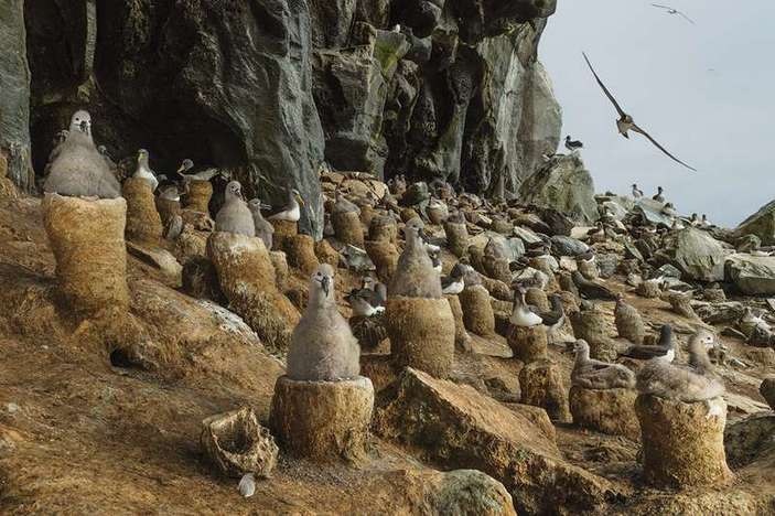 Кто принес сюда эти глиняные горшки? И почему на них сидят чатемские альбатросы? На самом деле, это гнезда. И сделаны они действительно из глины и почвы. Альбатросы гнездятся на голых скалистых берегах, где яйца могут переохладиться. Поэтому такие конструкции повышают шансы потомства на выживание. Кстати, одно и то же гнездо пара альбатросов может использовать в течение многих лет. Размножаются эти птицы с августа по апрель. Около 70 дней пара высиживает единственное яйцо в кладке. А когда птенец вылупляется, попеременно его кормят. В горшке гнезде птенцы проводят около четырех месяцев. И к концу этого срока начинают ненадолго его покидать, чтобы размять крылья. А потом просто улетают в открытое море и начинают самостоятельную жизнь.