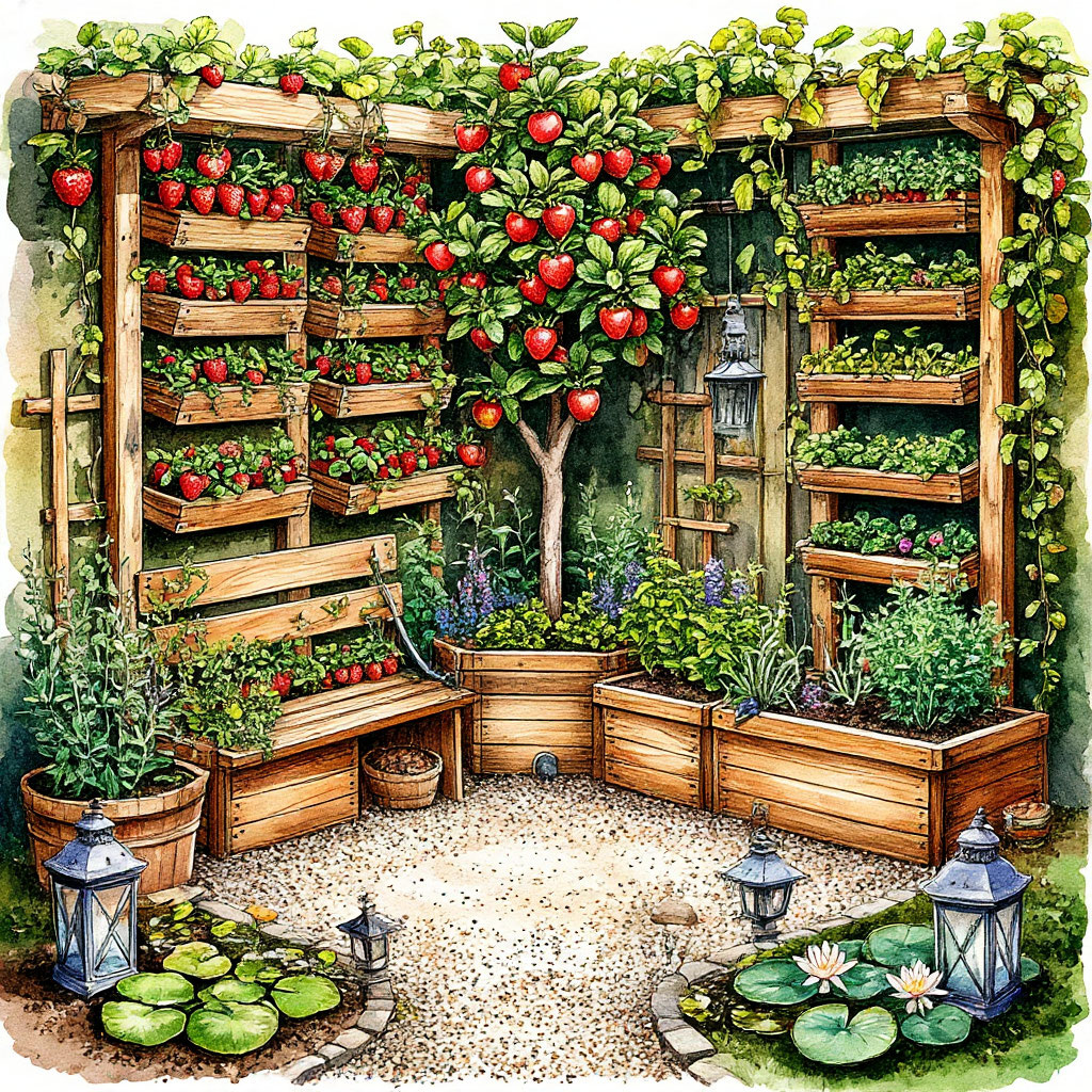 - Сад + зона отдыха – скамейка под яблоней, стол среди грядок.
