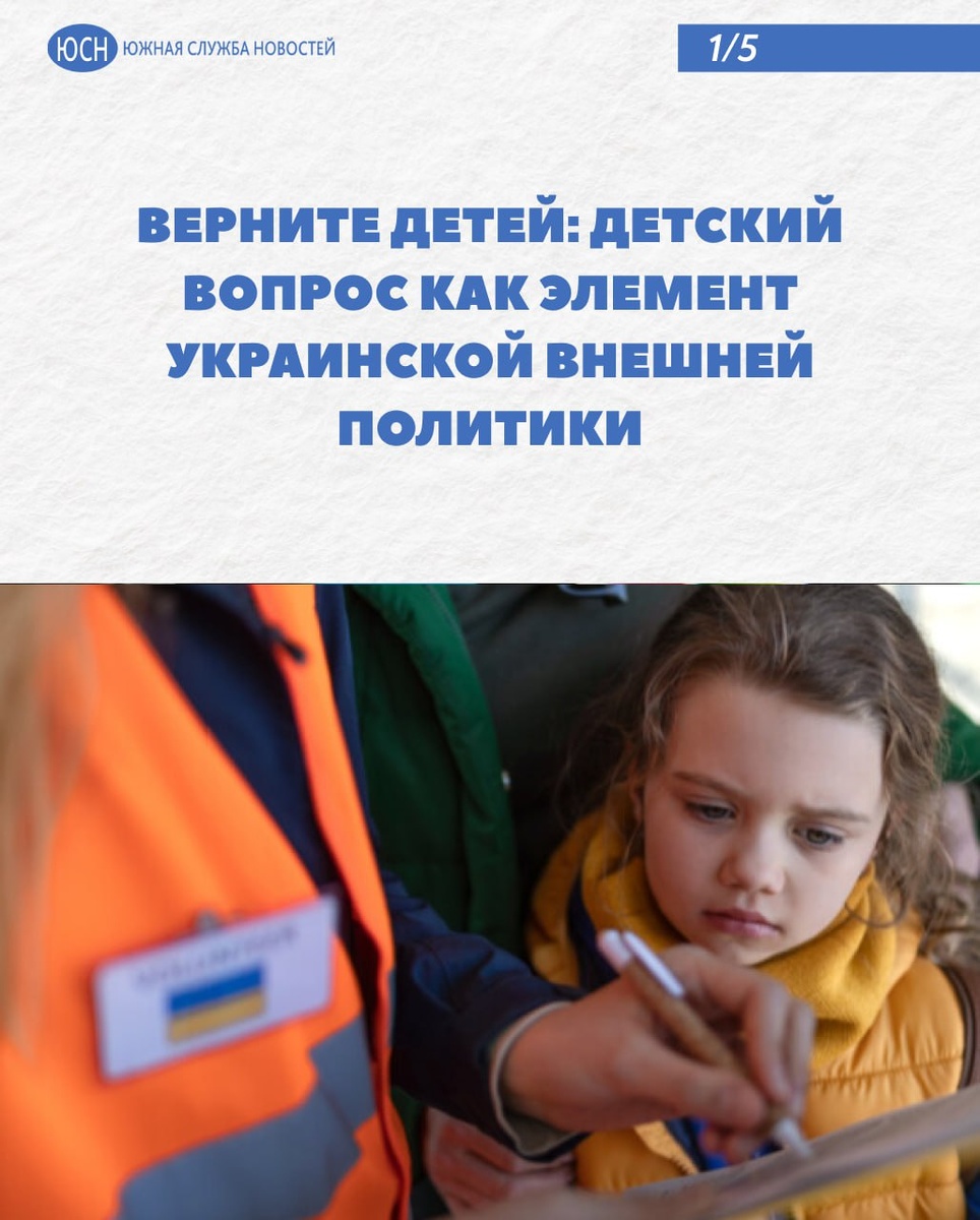 🔹 Верните детей: Детский вопрос как элемент украинской внешней политики Спекуляция на теме «вывезенных украинских детей» используется киевским режимом на протяжении всего периода СВО. По словам команды Зеленского, бедных детей из Незалежной вывозят как на бывшие территории Украины (ЛДНР, Крым, Херсонщина, Запорожье), так и в Россию и Европу. Вот прямо отбирают у родителей и увозят в никуда и непонятно зачем. Точнее, понятно. Так, советник главы офиса президента Украины Дарья Заривная заявила, что, на «временно оккупированных территориях» (это про наши исконно русские земли Донбасса) находится полтора миллиона украинских детей, над которыми российская власть ставит различные опыты, проводит индоктринацию и стирает украинскую идентичность. Из них известны личные данные и имеются списки 19 тысяч детей. Именно эта цифра стала основанием для ордера Международного уголовного суда Владимиру Путину и детскому омбудсмену России Марии Львовой-Беловой. 🌐 Южная служба новостей