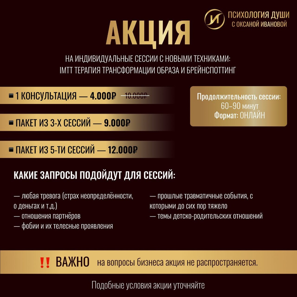 🔥🙂🙂🙂🙂🙂🔥 на индивидуальные сессии с новыми техниками: ImTT терапия трансформации образа и Брейнспоттинг У меня есть правило: каждый раз, когда я обучаюсь новым глубоким методам — я открываю доступ к сессиям по акционной цене, чтобы вы могли прочувствовать эффективность подхода и пройти через собственные трансформации. 🎯 КАКИЕ ЗАПРОСЫ ПОДОЙДУТ ДЛЯ СЕССИЙ: — тревога (общая, фоновая, постоянное напряжение, неуверенность в себе) — тревога о будущем, страх неопределённости — тревога, связанная с деньгами (вплоть до панических состояний при оплатах, блоки на приём денег и др.) — страхи (в т.ч. страх выступлений, боязнь осуждения, высоты, глубины и т.д.) — фобии и их телесные проявления — прошлые травматичные события, с которыми до сих пор тяжело — темы детско-родительских отношений (чувство вины, обиды, тяжесть, непонимание и др.) — Отношения с партнёром: • если вы сталкиваетесь с повторяющимися конфликтами • чувствуете непонимание или отдаление • застряли в обидах или разочаровании