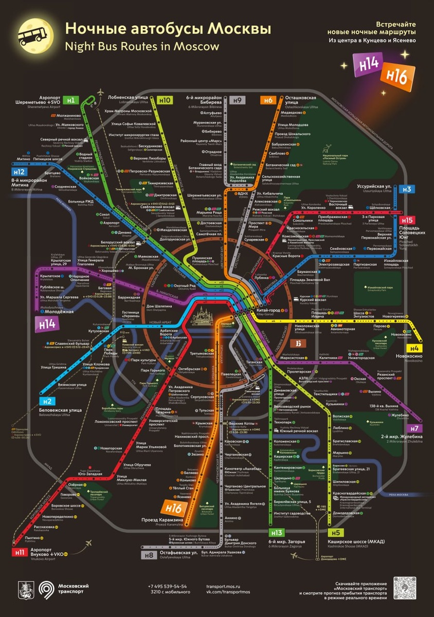 В столице работает разветвлённая сеть ночных автобусов. Она связывает практически все округа с центром города, аэропортами Внуково и Шереметьево, а также с главными железнодорожными вокзалами и ключевыми транспортными узлами.