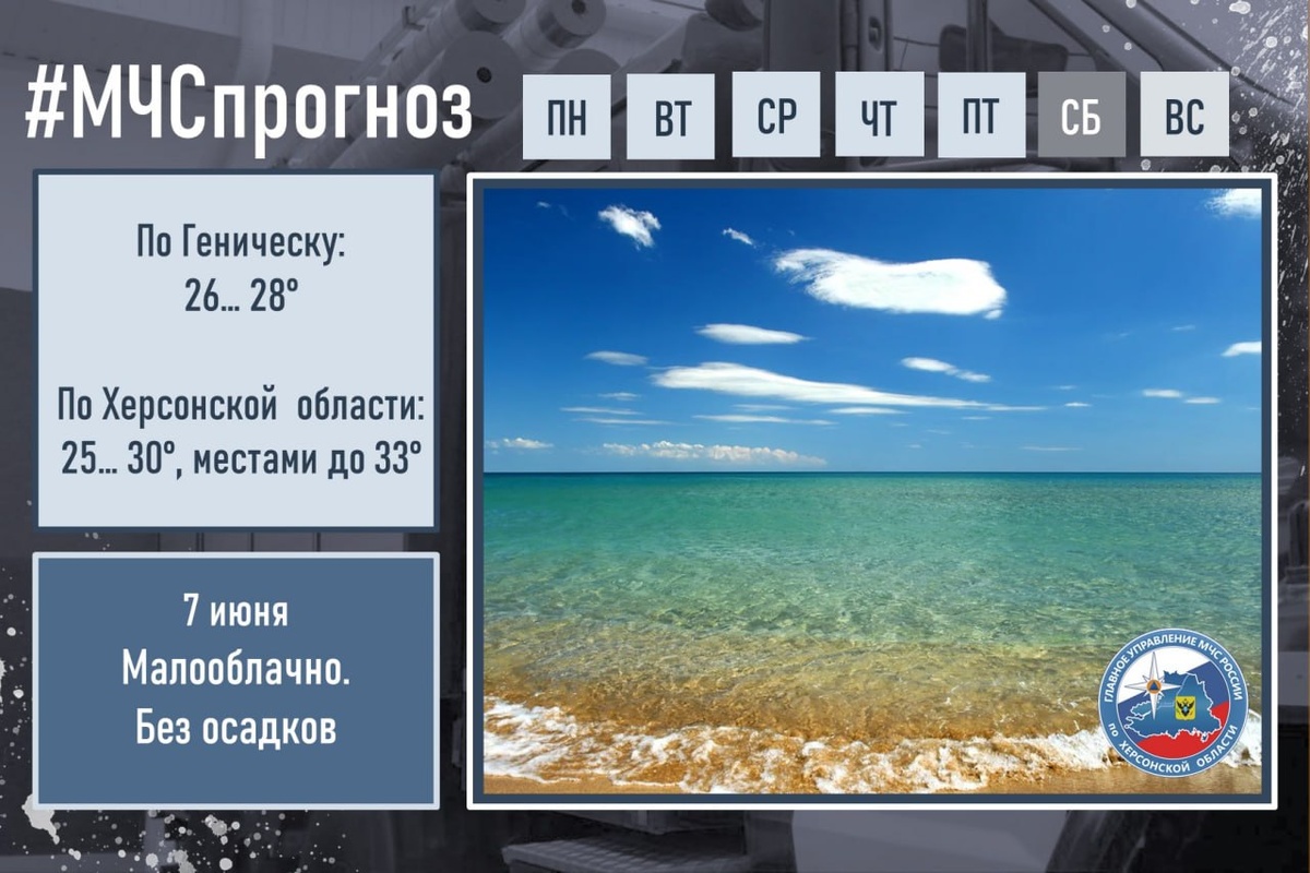 #МЧСпрогноз 🤝 июня в городе Геническ ожидается: малооблачно. Без осадков. Ветер переменных направлений 3-8 м/с. Температура воздуха ночью 19...21°, днём 26...28°. По Херсонской области: малооблачно. Без осадков. Ветер переменных направлений 3-8 м/с. Температура воздуха ночью 17...22°, местами до 11°; днём 25...30°, местами до 33°. 💡При перепадах электроэнергии выключи все электроприборы из розеток!