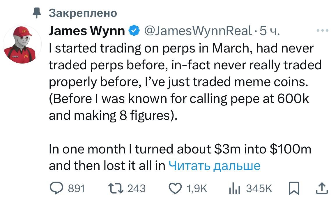 ✝️😭Исповедь Трейдера который за неделю потерял $100 млн 🌐Я начал торговать на фьючерсах в марте — до этого вообще никогда ими не занимался, да и в целом серьезной торговли у меня не было. Раньше я просто игрался с мем-коинами. (До этого меня знали за то, что я нашёл Pepe, когда он стоил всего $600k, и тогда я заработал восьмизначную сумму.) За месяц я превратил примерно $3 миллиона в $100 миллионов… а потом слил всё за неделю на HyperLiquid. Я просто делал своё дело, но в какой-то момент это стало привлекать внимание — аккаунт быстро стал вирусным, набрал сотни тысяч подписчиков, ведь всё было прозрачно и отслеживалось на блокчейне. Ну, я и подхватил волну. В общем, с этим внезапным вниманием всё быстро вышло из-под контроля. Торговля превратилась в чистой воды азарт — я пытался отыграться, вернуть то, что потерял, и не выглядеть идиотом в глазах людей: мол, сделал $100 миллионов и тут же всё слил. Я стал жадным. Перестал воспринимать цифры на экране всерьёз. А тем временем Гипе