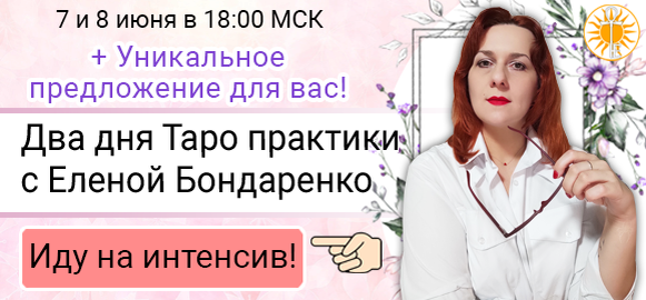 Приветствую! На связи Елена Бондаренко! 🤦♀️ Я перед вами виновата..... В том, что давно не проводила практику! Это непростительная оплошность, но я постараюсь ее исправить 😁. 📍 Мы устроим нашу традиционную двухдневную практику, где мы с вами вместе научимся делать универсальные расклады и разберем ваши примеры. А ещё я поделюсь с вами супер важными секретами! 🕔 Когда встречаемся? 7 и 8 июня в 18:00 МСК. Приглашаю на практику всех, кто: 🔸только начинает свой путь в Таро - получите в копилочку полезный расклад, советы по его трактовке и методике изучения карт. 🔸практикует гадание на Таро более уверенно - получите дополнительную практику и рекомендации для дальнейшего роста. 🔸и всех, кто хочет знать и уметь больше остальных! Переходите по ссылке и⬇️ вам откроется вводный урок, там вы узнаете, как подготовиться к интенсиву. ИДУ НА ИНТЕНСИВ ❓ Если есть вопросы по Таро, задайте их в прямом эфире - постараюсь ответить на все! 🕔 Итак, встречаемся в субботу 7 июня в 18:00 МСК на пе