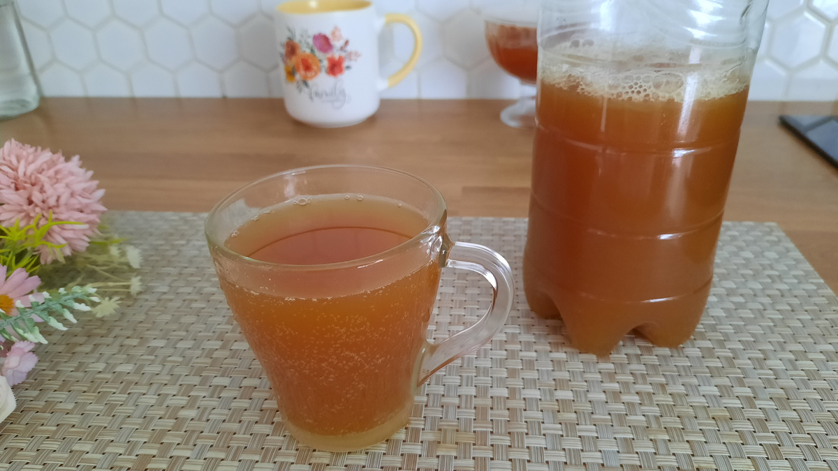 Квас из цикория - простой в приготовлении освежающий напиток, который можно приготовить за пару часов в домашних условиях. Вкус такого напитка напоминает Советский квас из бочки. Для приготовления такого вкусного кваса подойдет растворимый порошкообразный цикорий, а также жидкий экстракт цикория. Квас получается очень вкусный пенистый газированный. Нам понадобится : - Вода кипяченая теплая - 1,5 литра - Сахар - песок - 2 ст.л. - Цикорий растворимый - 1 ч.л. - Дрожжи сухие х/п - 1/2 ч.л. - Изюм, кусочки фруктов - по желанию. В стакан всыпаем сахар, Добавляем цикорий, Также сухие дрожжи и все сухие ингредиенты перемешиваем, И вливаем кипяченую воду теплую 40 градусов не более, И хорошо перемешиваем до растворения сахара, Готовый раствор вливаем в банку и закрываем крышкой. Также можно добавить изюм или кусочки фруктов по желанию.. Удобно готовить в 1,5 литровой бутылке. Через несколько часов брожения можно пить. Открываем осторожно, так