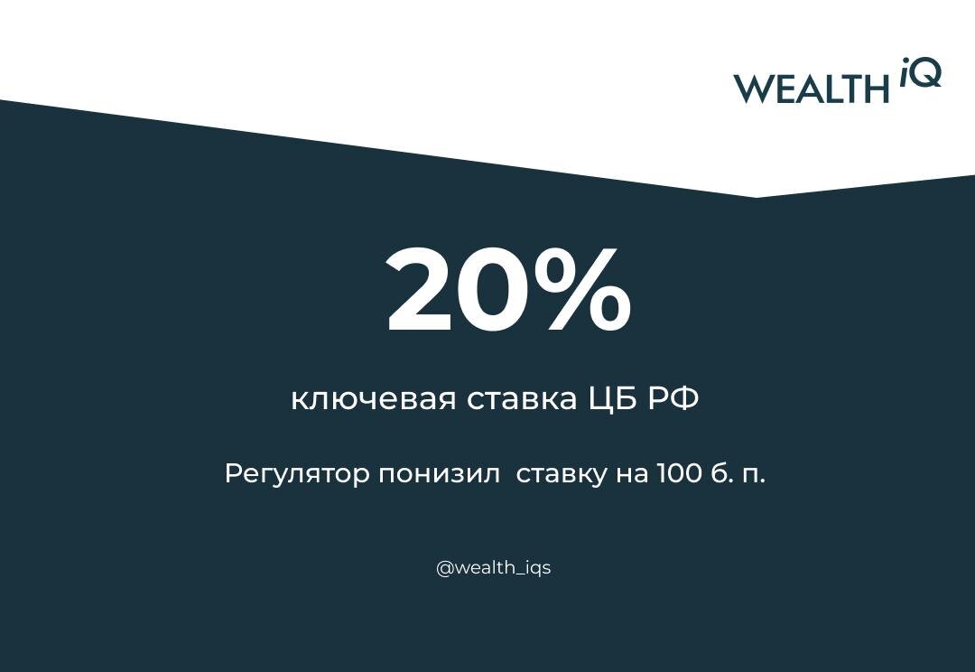 ❗️ Ключевая ставка ЦБ — 20%. Регулятор понизил ставку на 100 б. п. Также в ЦБ заявили, что регулятор будет поддерживать такую жесткость денежно-кредитных условий, которая необходима для возвращения инфляции к цели в 2026 году. Это означает продолжительный период проведения жесткой денежно-кредитной политики. Дальнейшие решения по ключевой ставке будут приниматься в зависимости от скорости и устойчивости снижения инфляции и инфляционных ожиданий. Также в ЦБ отметили, что проинфляционные риски немного уменьшились, но все еще преобладают над дезинфляционными на среднесрочном горизонте. 🏦 @wealth_iqs