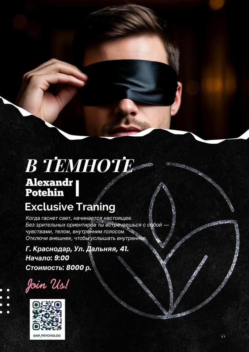 Проект "В темноте" представляет собой уникальную возможность для самопознания, позволяющую участникам преодолеть внутренние преграды и обнаружить свои скрытые возможности. Проект в темноте – это восемь часов в абсолютной темноте и тишине, во время которых участники выполняют задания с закрытыми глазами, выражая свои эмоции без слов. Этот опыт способствует осознанию неэффективных моделей поведения и поиску новых стратегий для укрепления уверенности и достижения поставленных целей. Участники имеют возможность столкнуться со своими внутренними страхами и преодолеть их, освобождая тем самым место для счастья и успеха. Методика тренинга направлена на развитие интуиции, позволяя участникам чувствовать разницу между живой и мёртвой энергией. В этом пространстве участники взаимодействуют друг с другом, не видя лиц, но чувствуя связь на глубоком уровне, как душой, так и телом. Кроме того, движения в полной темноте предлагают возможность отпустить контроль, избавиться от напряжения и насл