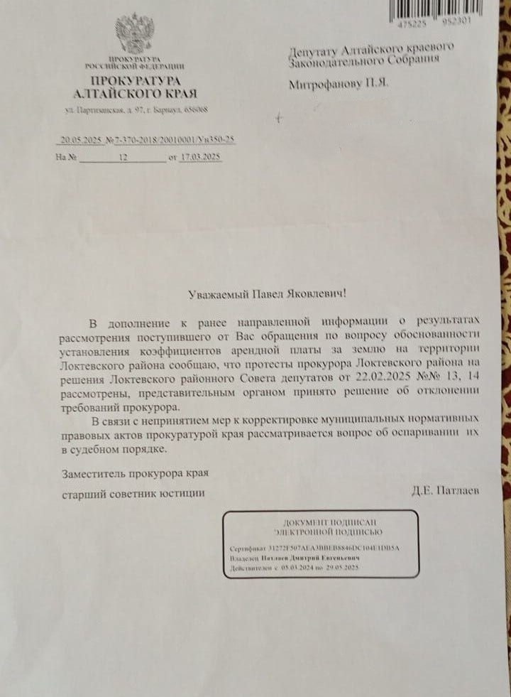 Депутат фракции КПРФ в АКЗС Павел Митрофанов борется за отмену незаконных коэффициентов, применяемых к расчету годовой арендной платы за землю на территории Локтевского района. Еще в феврале 2025 года решением районного Совета были утверждены завышенные коэффициенты на аренду земельных участков в Локтевском районе, госсобственность на которые не разграничена. Утвердив повышенные коэффициенты, районные власти, кроме того, незаконно распространили их на земельные правоотношения уже с начала 2025 года. В итоге аренда земли в Локтевском районе стала значительно выше, чем в соседних районах, и даже больше, чем в городе Барнауле. Так, например, если коэффициент для индивидуальной жилой застройки в Барнауле составляет 0,002, то в Локтевском районе он 0,026, для пашни – 0,004 и 0,045 соответственно. Выступая на сессии райсовета, Павел Митрофанов отметил, что принятое решение ставит в тяжелое положение местное предпринимательское сообщество, а в конечном итоге – простых жителей района: – С