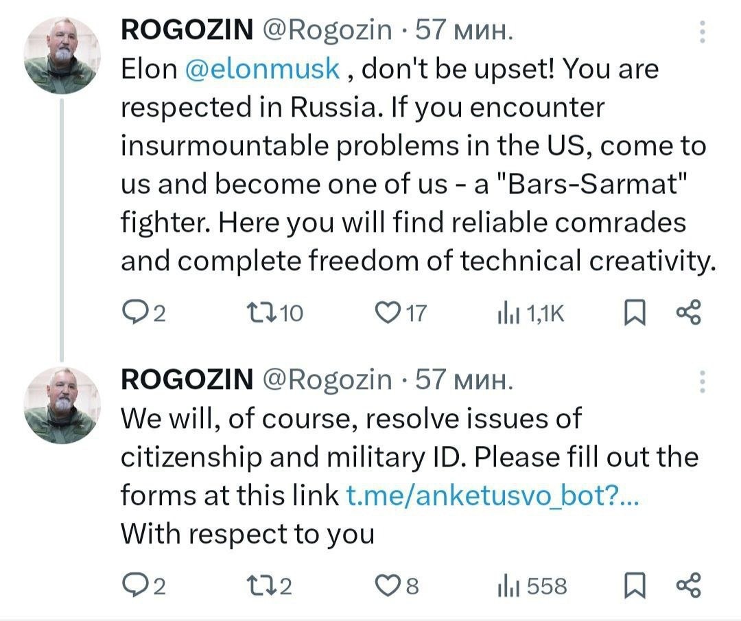 Дмитрий Рогозин явно решил, что космической карьеры недостаточно для полноты счастья. Теперь экс-глава Роскосмоса берется за кадровое обеспечение СВО и лично пригласил Илона Маска подписать контракт на фронт. Надо отдать должное - подход системный. Раньше Рогозин предлагал американскому миллиардеру летать на батуте, теперь решил, что пора и окопы покопать.