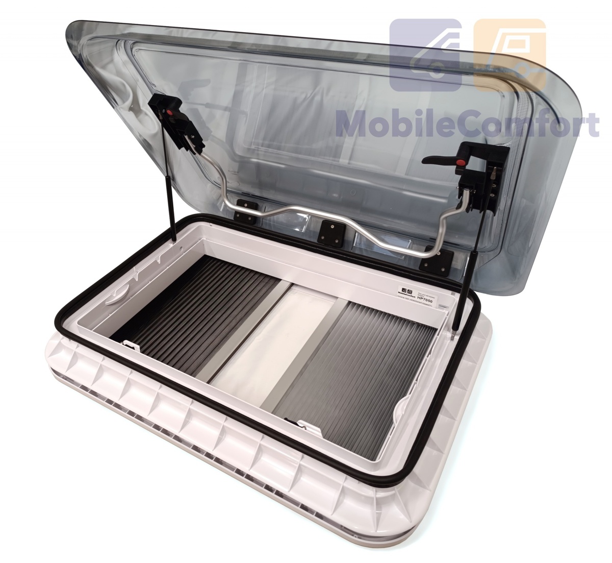 Люк 70x50см, откидной накрышный LED MobileComfort HP7050. Линейка потолочных люков MOBILECOMFORT отличается высоким качеством и долговечностью. Благодаря внешнему аэродинамическому профилю верхней крышки, не требуется установка дополнительного спойлера. Запатентованное резиновое уплотнение на внутренней раме люка гарантирует водонепроницаемость. Люк изготовлен из высококачественных материалов. Алюминиевая усиленная рама, купол люка двойное акриловое стекло с тонировкой устойчивое к ультрафиолетовому излучению. Поставляется с солнцезащитной плиссированной шторкой и москитной сеткой. Двух типоразмеров 400х400 и 700х500 мм Люк откидной 70х50 для автодомов.